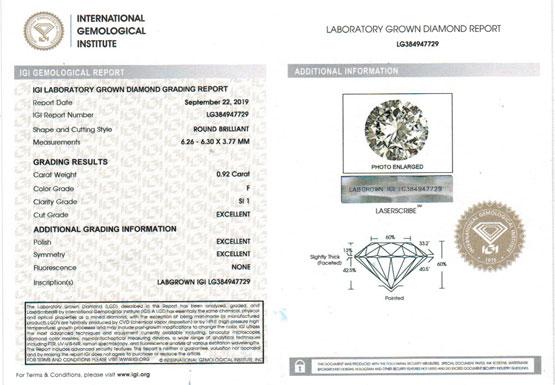 Προκειμένου να διασφαλιστεί το δίκαιο εμπόριο και η δέουσα επιμέλεια, ώστε να γνωρίζετε ακριβώς τι αγοράζετε, το Γεμολογικό Ινστιτούτο όπου είναι τεκμηριωμένα τα διαμάντια της ZOY, φροντίζει να επισημαίνει με σαφήνεια τα πιστοποιητικά που εκδίδει για τα εργαστηριακά διαμάντια. Μπορείτε να δείτε στο αντίγραφο του πιστοποιητικού στον ιστότοπο του Διεθνούς Γεμολογικού Ινστιτούτου (IGI) ότι το χρώμα φόντου ενός πιστοποιητικού διαμαντιού εργαστηρίου είναι κίτρινο, σε αντίθεση με το χρώμα φόντου ενός πιστοποιητικού για ένα διαμάντι, το οποίο είναι λευκό.
